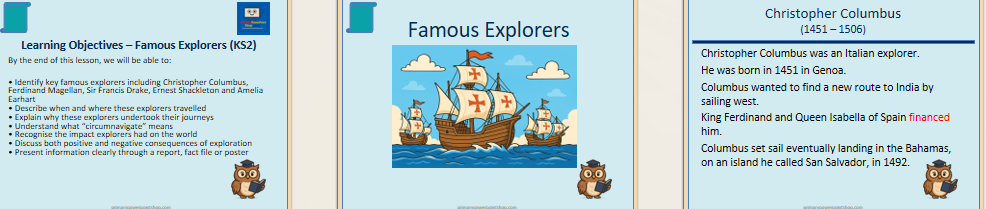 An engaging KS2 History PowerPoint (28 slides) exploring Christopher Columbus, Magellan, Drake, Shackleton and Amelia Earhart. Includes independent task, impact discussion and interactive quiz.