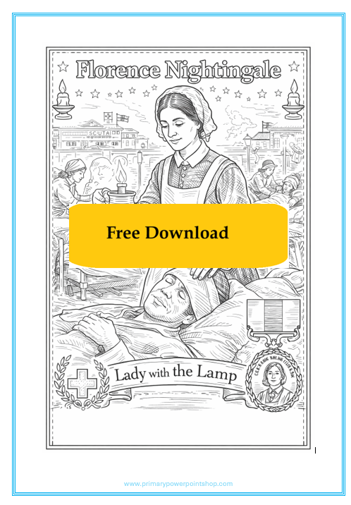 This detailed colouring page features Florence Nightingale, famously known as “The Lady with the Lamp”, helping wounded soldiers during the Crimean War. It provides a calm, creative way for pupils to connect with this important historical figure.
