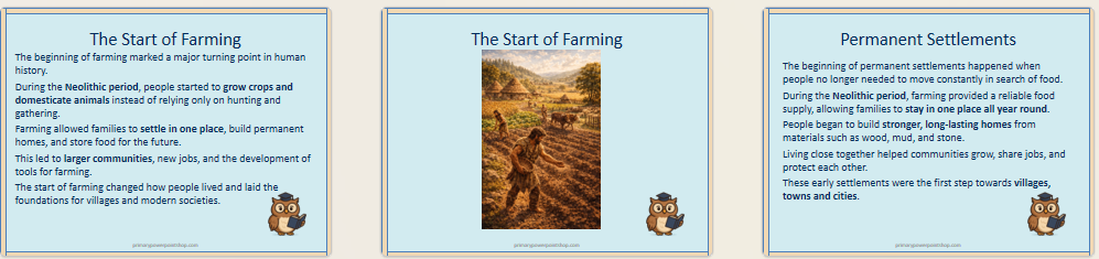 Designed for KS2 history, this lesson clearly explains the shift from mobile hunter-gatherer communities to settled farming villages, helping children understand why this period was such a major turning point in human history.