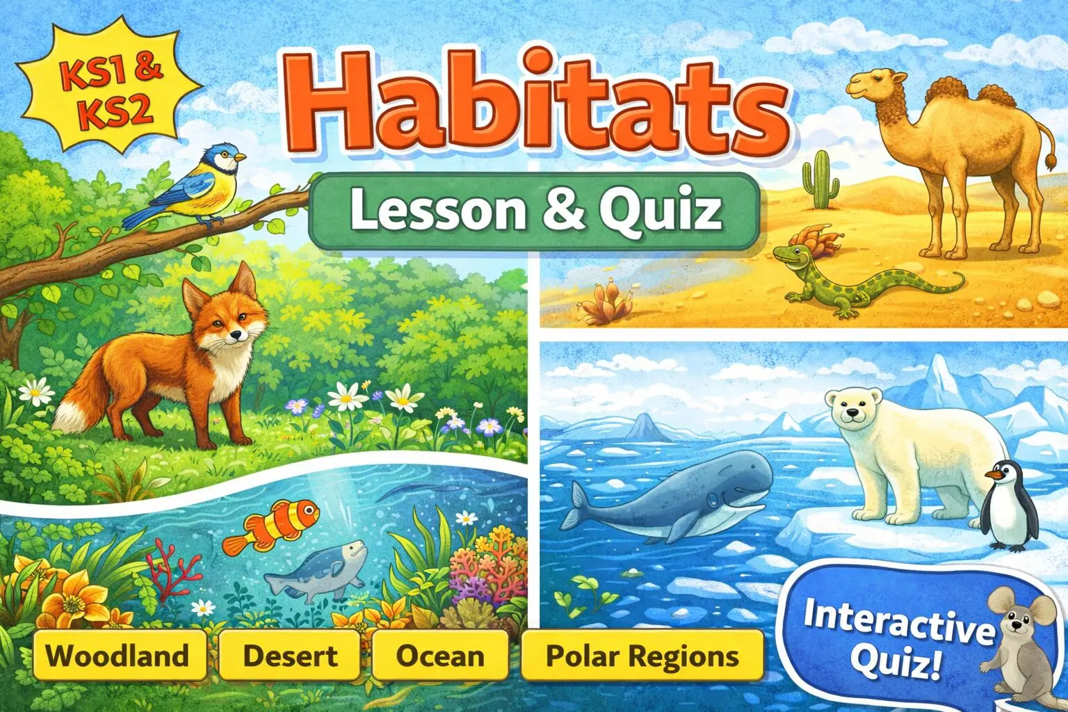 Engaging KS1 & KS2 Science PowerPoint lesson (12 slides) on habitats, including woodland, desert, ocean and polar regions, with interactive quiz and answers included.