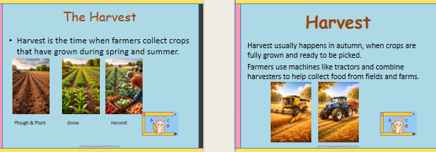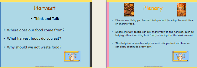 A ready-to-use Harvest lesson (10 slides) and assembly for KS1 & KS2. Covers farming, autumn crops, gratitude, sharing and caring for the environment.