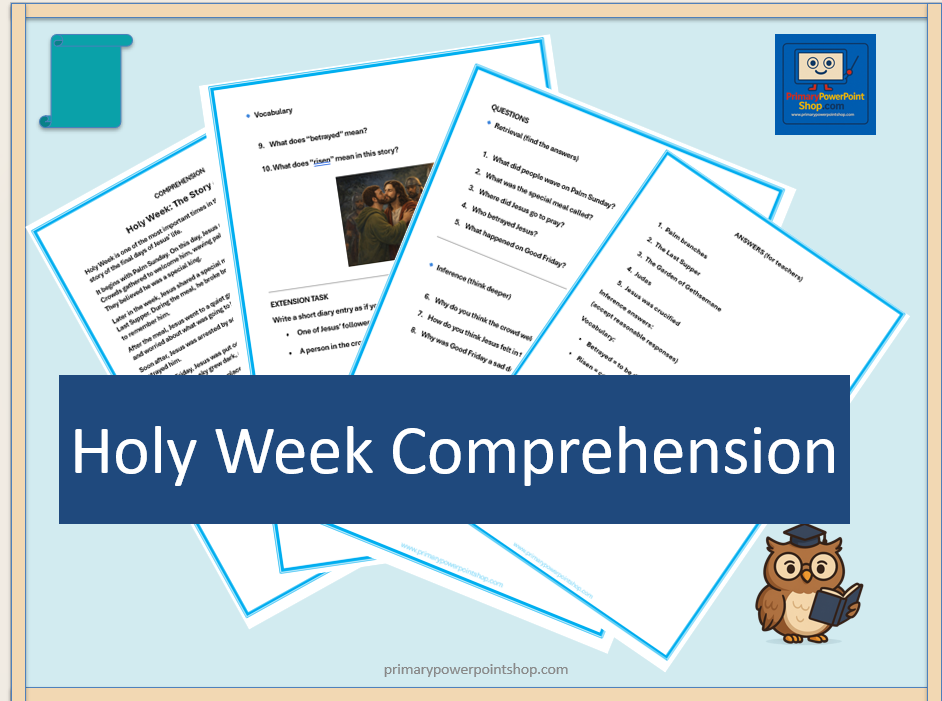 Teach the story of Holy Week with this clear and engaging KS2 comprehension worksheet. Includes reading text, questions and answers – perfect for Easter lessons.