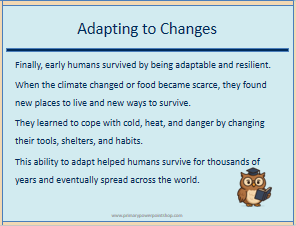 This How Did Early Humans Survive KS2 lesson explores how people lived in the Stone Age, including hunting, gathering, shelter, fire, tools and adaptation to harsh environments. Pupils learn about hunting and gathering, the importance of fire, the development of tools, early communication, teamwork and adaptation.