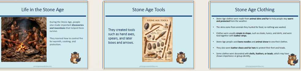 Engaging KS2 Stone Age lesson (19 slides) exploring how early humans survived through hunting, fire, tools, communication and adaptation. Includes discussion tasks, guided practice and an independent activity. Ready-to-teach and ideal for Stone Age topics.