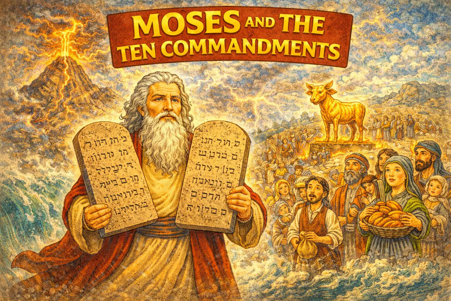 This comprehensive lesson follows the journey of Moses from his birth in Egypt through the Exodus, the miracles in the wilderness, the giving of the Ten Commandments at Mount Sinai, the Golden Calf, and the journey toward the Promised Land.