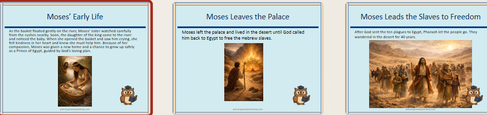 A complete KS2 Religious Education lesson (30 slides) exploring Moses, the Exodus, Mount Sinai, the Ten Commandments, the Golden Calf and the Promised Land. Includes structured storytelling and built-in quiz activities.