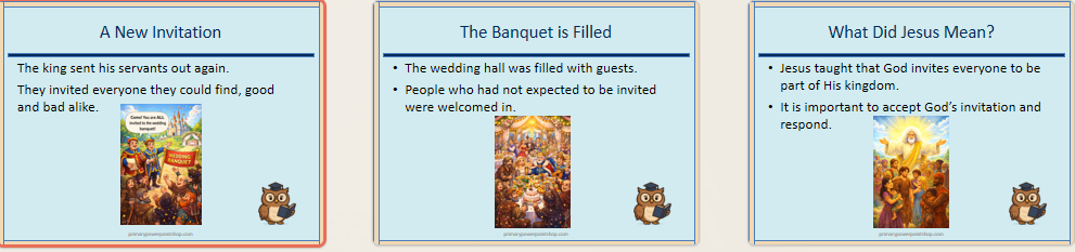 A clear and engaging KS1 & KS2 RE lesson (16 slides) exploring The Parable of the Wedding Banquet. This structured PowerPoint helps pupils understand God’s invitation, inclusion, and the importance of responding to faith.