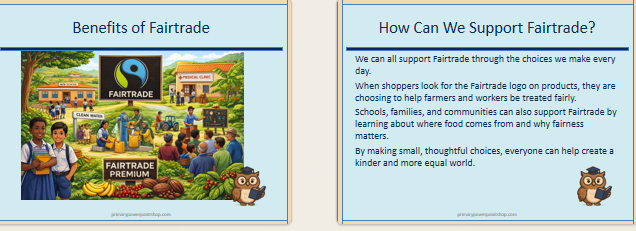 A clear and engaging KS2 Fairtrade PowerPoint lesson (17 slides) introducing pupils to global fairness, ethical trade, and responsible consumer choices. Includes interactive discussion prompts, independent activities and reflection questions.