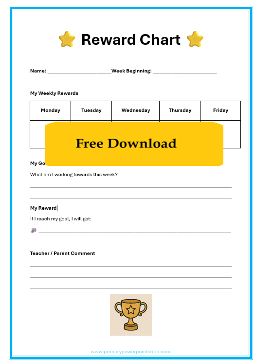 Reward charts are an effective way to help pupils develop good habits and celebrate achievements. This printable chart allows children to collect stars, stickers or ticks when they meet their goals.