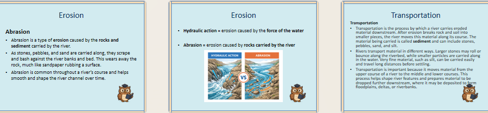 Comprehensive KS2 geography lesson (20 slides) on river processes. Teach erosion, transportation and deposition, including hydraulic action, abrasion, traction, saltation, suspension and solution. Includes guided discussion and independent tasks.