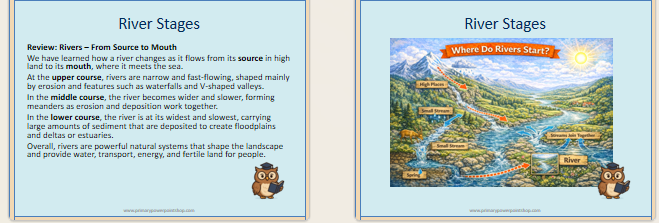 Comprehensive KS2 rivers review lesson (19 slides). Recap river stages, features, processes and human impact with structured revision slides, quiz questions and plenary reflection tasks. Perfect end-of-unit assessment.