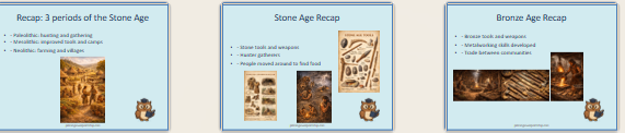 Through structured recap slides, timeline activities and comparison tasks, pupils reflect on how tools, homes, food and society changed over time. The lesson supports assessment and provides opportunities for pupils to demonstrate understanding through creative and analytical tasks.
