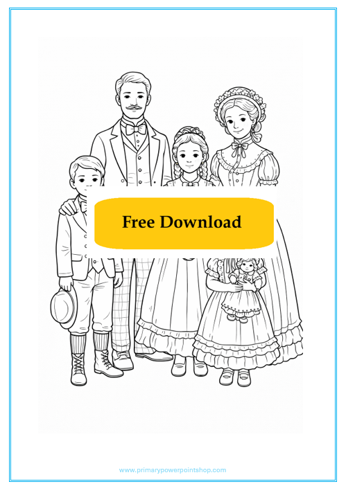 This free resource allows children to explore what life was like for a Victorian family. Pupils can colour the scene while discussing clothing, social roles, and daily life during the Victorian era.