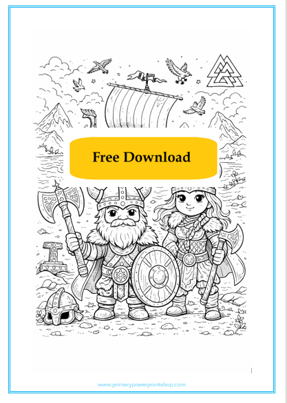 This free printable Vikings colouring sheet allows children to explore key aspects of Viking life, including clothing, weapons, and daily activities. Pupils can colour the illustration while discussing who the Vikings were and how they lived.