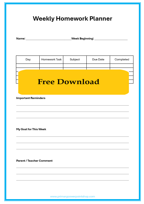 This free weekly homework planner helps pupils organise homework tasks, track due dates and monitor completed work. Ideal for KS1 and KS2 pupils developing independent learning habits.